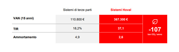 A fronte di un investimento solo leggermente superiore a quello di una soluzione tradizionale, la proposta nell'esempio consente un più rapido ammortamento dell'investimento, grazie al superiore risparmio di risorse nel tempo.