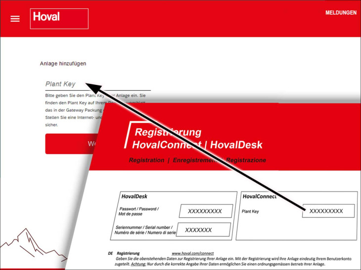Può trovare la sua Plant Key sul foglio di registrazione che ha ricevuto insieme al gateway HovalConnect (v. figura). Se ha smarrito il foglio di registrazione, la preghiamo di rivolgersi all'assistenza HovalConnect scrivendo all'indirizzo connect@hoval.com.