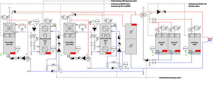 Il flusso dell'energia è il seguente: sugli alloggiamenti delle stazioni di cogenerazione i tecnici impiantisti hanno flangiato canali di immissione ed espulsione dell'aria. Sul versante dell'emissione hanno integrato uno scambiatore di calore aria/acqua. Tali dispositivi integrativi raccolgono il calore emesso dai due PowerBloc e lo trasferiscono alle pompe di calore Hoval Thermalia twin H (20) con due stadi di potenza termica da 10 e 20 kW (da cui la denominazione twin) e Thermalia dual H (60) da 60 kW. Esse, a loro volta, convogliano il calore residuo degli impianti di cogenerazione nel ritorno lato riscaldamento verso i generatori di calore ed elettricità: con un COP compreso tra 4,4 e 4,9, esse elevano la temperatura di ritorno in media da 60 a 65 °C.