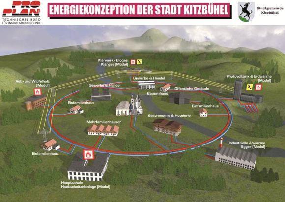 La prima centrale termica del sistema di teleriscaldamento di Kitzbühel è già stata realizzata: una caldaia a cippato da 1500 kW di potenza fornisce il calore per la sottostazione di trasmissione Hoval TransTherm PRO. Quest’ultima è posizionata nel locale caldaia della scuola, dove un tempo era ospitata una caldaia a olio combustibile.