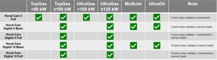 Hoval Care Digital basic*: Estensione della garanzia convenzionale a 5 o 10 anni, solo corpo caldaia. Incluso canone SaaS Hoval Supervisor per l'intera durata del periodo di garanzia (manodopera esclusa dopo i primi 24 mesi).