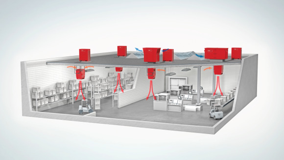 Grazie alla struttura modulare, il sistema di climatizzazione decentralizzato per grandi ambienti è adatto sia ai requisiti previsti da centri di logistica per generi alimentari, sia da capannoni di produzione ad altezze fino a 25 metri.
