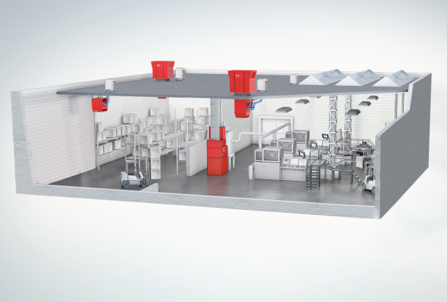 Sistema di ventilazione | Unità compatte per ventilazione, riscaldamento e raffrescamento di capannoni di produzione con recupero di calore dall’aria di processo.