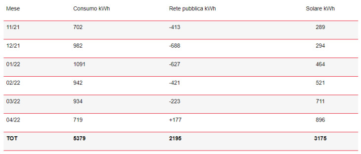 In tabella sono evidenziati i consumi elettrici e relativa fonte dei 6 mesi notoriamente più energivori