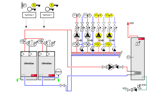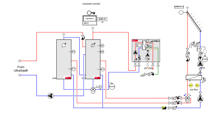 Ognuno dei due impianti prevede due puffer rispettivamente da 2.000 e 4.000 litri. Ogni caldaia Hoval UltraGas 700 D carica il puffer da 2.000 litri, collegato con 2 stazioni FLS 245 che producono in istantanea l’ACS necessaria a tutto il condominio. I pannelli solari mediante una stazione SLM 52 scaricano l’energia sul puffer da 2.000 litri se la temperatura è superiore a quella rilevata nell’accumulo. Se fosse inferiore, l’energia viene convogliata su quello da 4.000 litri che è collegato in serie a quello più piccolo.